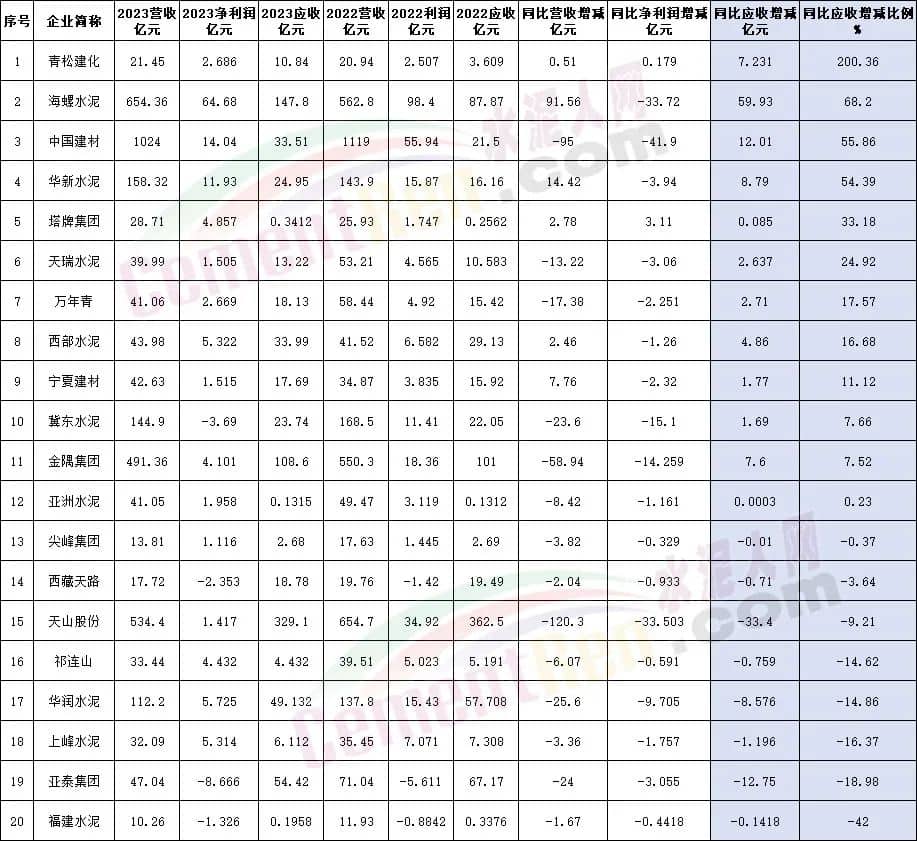 從應收款規模來看,20家上市企業中12家應收賬款增加,占比達60%。其中海螺水泥2023年上半年同比2022年同期應收賬款及票據增加59.93億元,增幅達68.2%。同期營業收入增加91.56億元,凈利潤減少33.72億元,增收不增利的情況明顯。