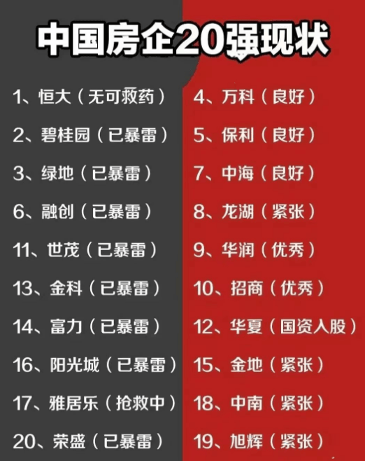從前20強房企現狀可見,目前9家企業已暴雷,1家搶救中,占比達50%。處于緊張狀態的4家企業。