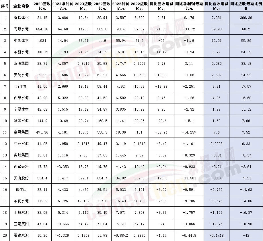 今年上半年各企業(yè)公布的半年報可見,20家上市企業(yè)中12家應收賬款增加,占比達60%。其中海螺水泥2023年上半年同比2022年同期應收賬款及票據(jù)增加59.93億元,增幅達68.2%。同期營業(yè)收入增加91.56億元,凈利潤減少33.72億元,增收不增利的情況明顯。