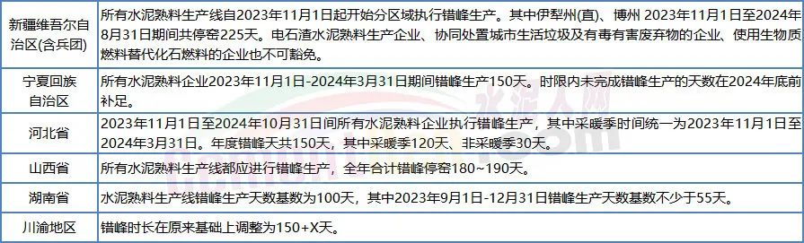 近期,新疆、寧夏等多地公布了2023-2024年錯峰生產計劃。水泥人網注意到,各區域的停產時間明顯延長,停產要求明顯加嚴。
