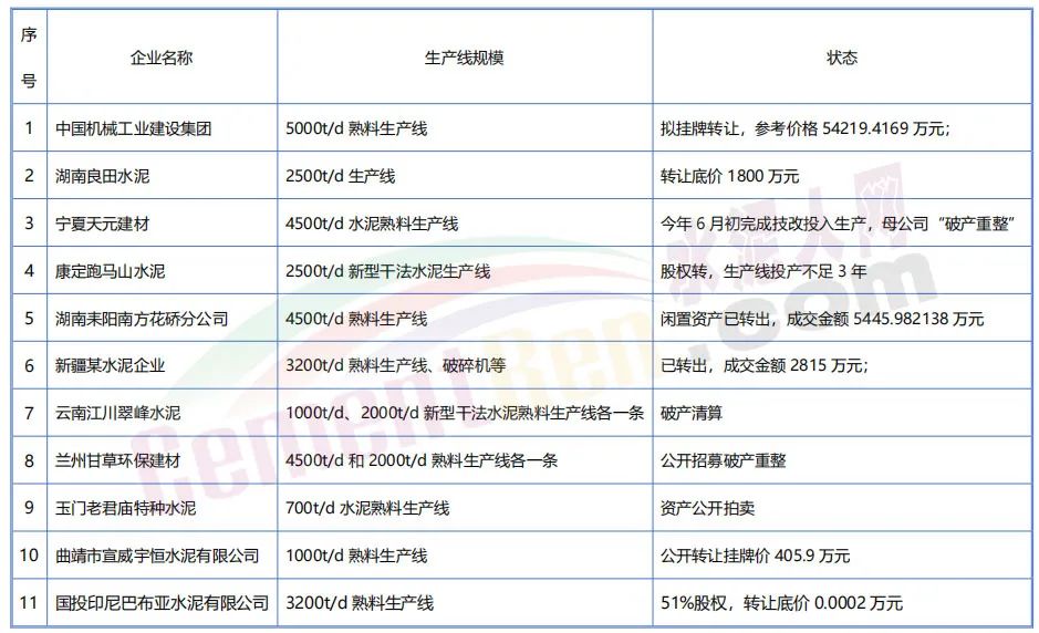 與此同時,多家水泥企業股權、指標、設備資產登上拍賣平臺。其中不乏2500t/d及以上規格熟料生產線,甚至還包含5000t/d生產線。