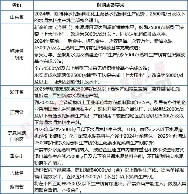 據水泥人網近期消息,繼山東省出臺計劃,明確2500t/d及以下水泥熟料生產線退出的時間后,福建、浙江、吉林、江西、寧夏、湖南多地也發布了2500t/d及以下水泥熟料生產線退出的時間表。