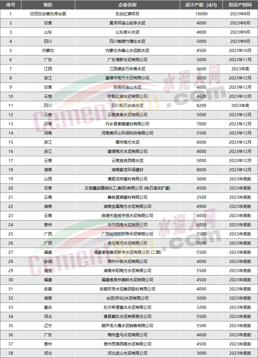 10月19日江西省工信廳分別發布宜春紅獅水泥和分宜海螺水泥兩條4500t/d熟料生產線的置換公示,紅獅水泥為補齊產能,分宜海螺為拆二建一。據水泥人網不完全統計,在此前通過的置換方案中計劃于2023年內點火投產的水泥熟料生產線項目達38條。