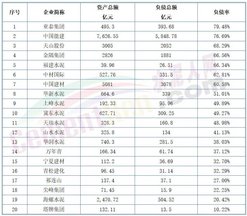 近期水泥行業(yè)各大上市公司先后發(fā)布了今年前三季度業(yè)績報告。其中亞泰集團(tuán)、中國能建、天山股份、金隅集團(tuán)、福建水泥、中材國際、中國建材等負(fù)債率超過50%。