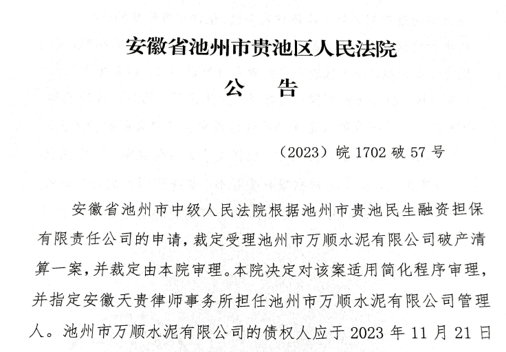 10月19日,安徽省池州市貴池區(qū)人民法院公告稱,安徽省池州市中級人民法院根據(jù)池州市貴池民生融資擔(dān)保有限責(zé)任公司的申請,裁定受理池州市萬順?biāo)嘤邢薰酒飘a(chǎn)清算一案。