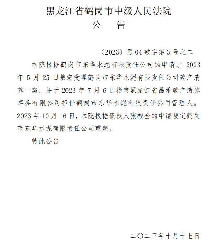 鶴崗市東華水泥有限責(zé)任公司被申請破產(chǎn)重整