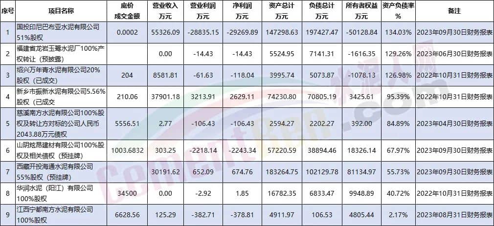 除已宣告破產(chǎn)的企業(yè)外,另有部分企業(yè)公開出讓股權(quán)。其披露信息顯示,資產(chǎn)負(fù)債率達(dá)100%以上。其中,國投印尼巴布亞水泥有限公司2023年09月30日財(cái)務(wù)報表顯示,資產(chǎn)負(fù)債率達(dá)134.03%。海螺水泥持股比例達(dá)49%,為其第二大股東。企業(yè)負(fù)債總計(jì)達(dá)19.74億,所有者權(quán)益為-5.01億,51%股權(quán)以2元底價出售。
