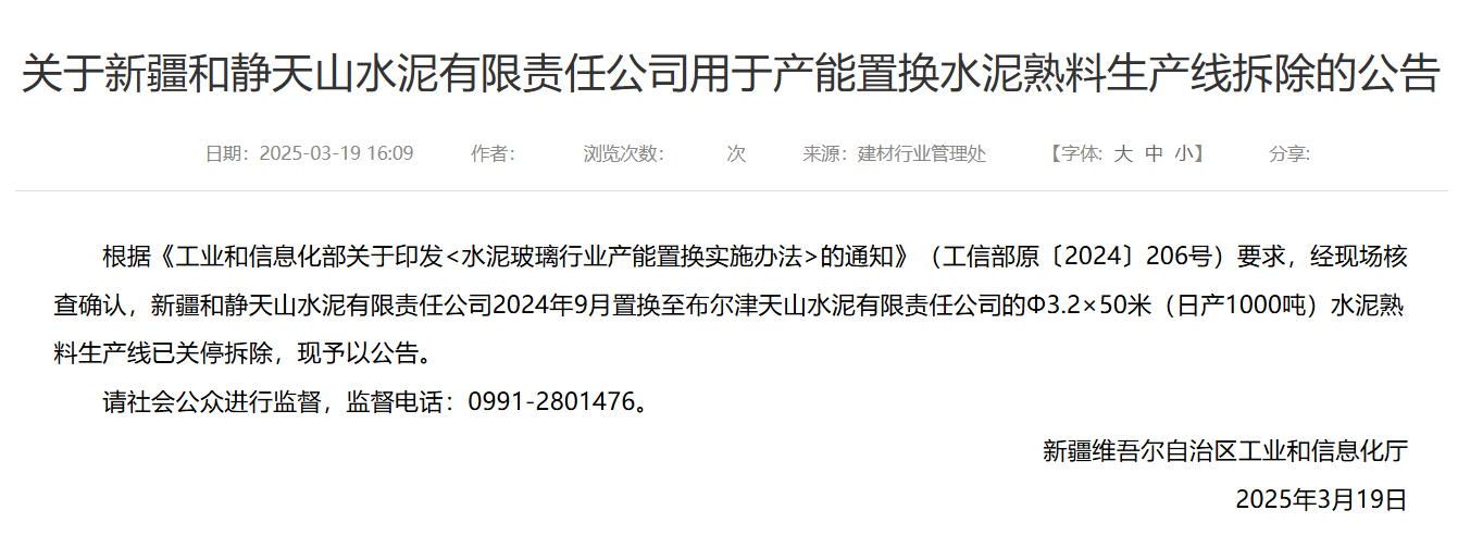 3月19日,新疆維吾爾自治區工業和信息化廳發布《關于新疆和靜天山水泥有限責任公司用于產能置換水泥熟料生產線拆除的公告》稱,根據《工業和信息化部關于印發<水泥玻璃行業產能置換實施辦法>的通知》(工信部原〔2024〕206號)要求,經現場核查確認,新疆和靜天山水泥有限責任公司2024年9月置換至布爾津天山水泥有限責任公司的Φ3.2×50米(日產1000噸)水泥熟料生產線已關停拆除,現予以公告。