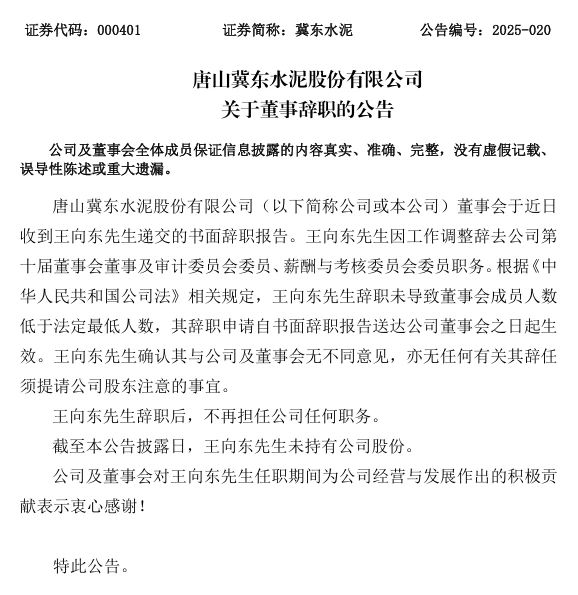 3月24日,冀東水泥發(fā)布公告。王向東先生因工作調(diào)整辭去公司第十屆董事會董事及審計(jì)委員會委員、薪酬與考核委員會委員職務(wù),不再擔(dān)任公司任何職務(wù)。