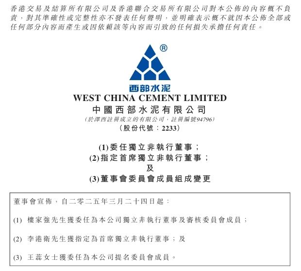 3月24日,西部水泥發布公告。樓家強獲委任為公司獨立非執行董事及審核委員會成員,李港衛獲指定為首席獨立非執行董事,王蕊獲委任為公司提名委員會成員。